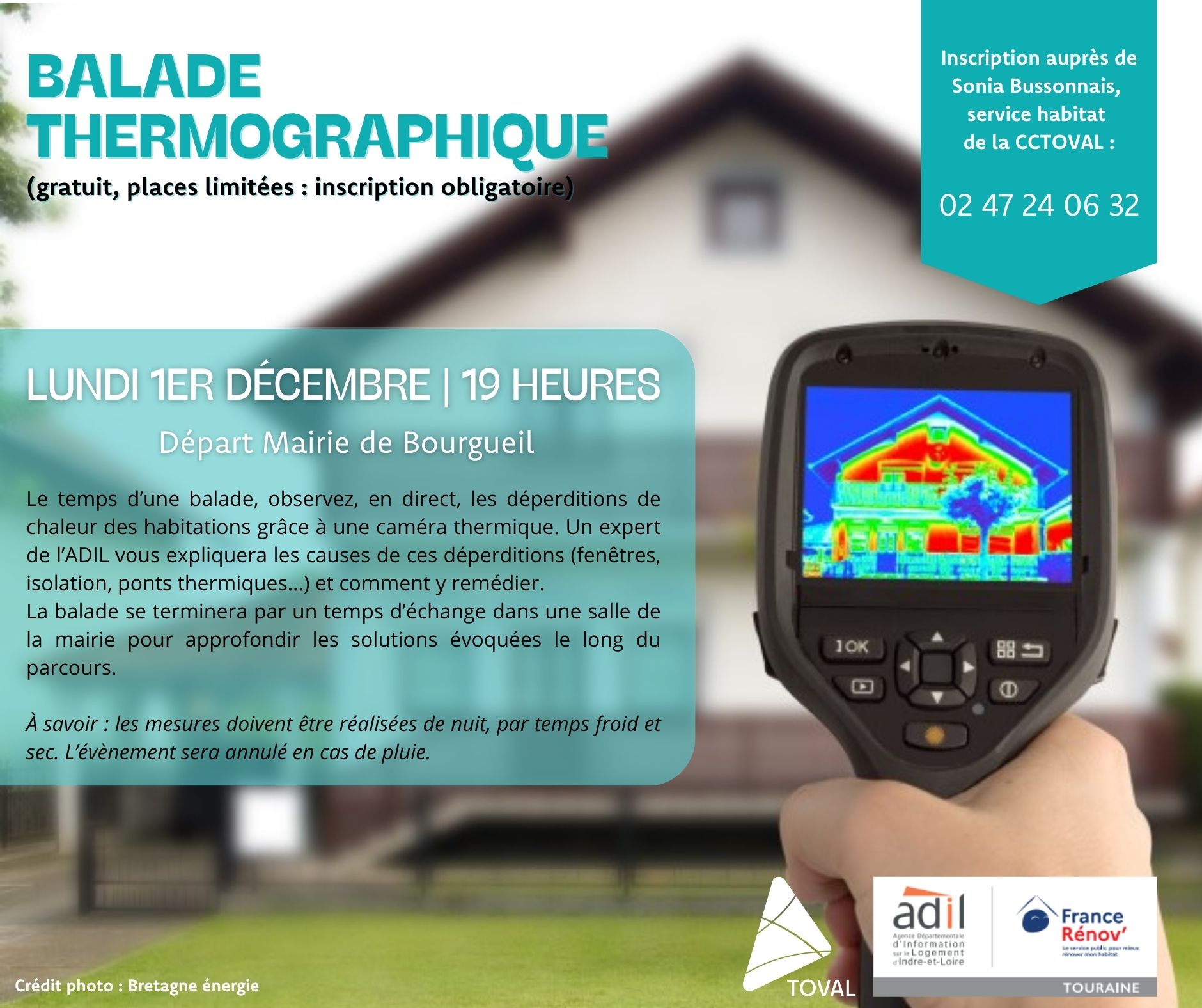 Le temps d’une balade, observez, en direct les déperditions de chaleur des habitations grâce à une caméra thermique. Un expert de l’ADIL vous expliquera les causes de ces déperditions (fenêtres, isolation, ponts thermiques…) et comment y remédier.