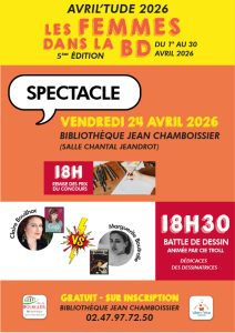 Dans le cadre d'Avril'Tude 24/04 : Spectacle 18h : Remise de prix du concours 18h30 : « Battle dessin » animée par la Cie Troll. Dédicaces des dessinatrices Claire Bouillhac et Marguerite Boutrolle (Bibliothèque Jean Chamboissier)