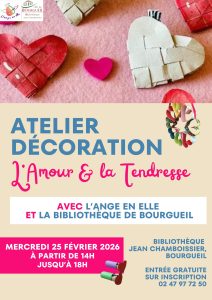 Atelier décoration Réalisez des décorations sur le thème de l’amour lors de cet atelier organisé par la bibliothèque et L’Ange en Elle. Atelier sur inscription – 14h/18h – 02.47.97.72.50