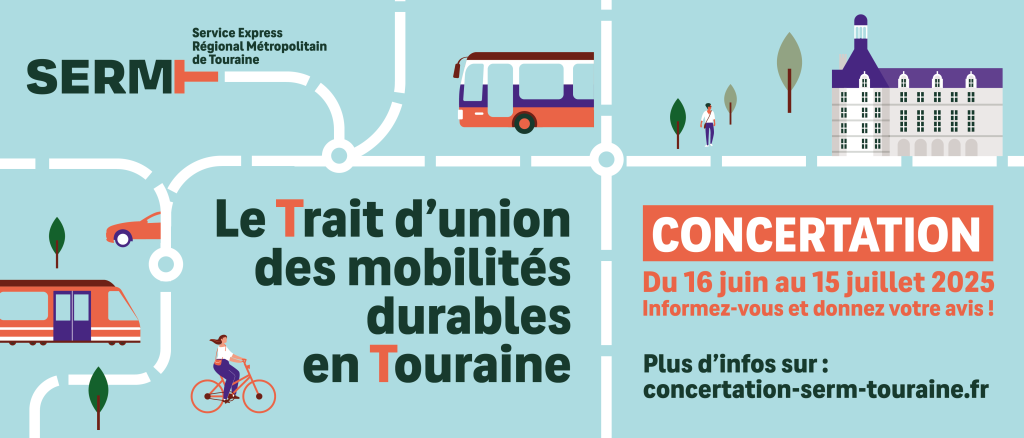 La Région Centre-Val de Loire et Tours Métropole Val de Loire organisent une concertation publique sur le Service Express Régional Métropolitain (SERM) de Touraine du 16 juin au 15 juillet 2025 >>> https://www.concertation-serm-touraine.fr/fr/