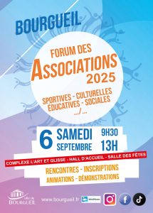 Samedi 6 septembre, de 9h30 à 13h, plus de 45 associations sportives, culturelles, de loisirs, solidaires et sociales de Bourgueil vous donnent rendez-vous dans le complexe l’Art et Glisse, le hall d’accueil et la salle des fêtes.   Seront présents : Sport Nature Bourgueillois, Bourgueil Rose, Rando club Bourgueillois, Sam Play, rhb les aligators, Fusion gliss'club, Amicale Cycliste du Bourgueillois, les 12 sections de l'Entente Sportive de Bourgueil (Karaté, Tennis de table, Roller, Découverte du sport, Badminton, Gymnastique volontaire, Football,…
