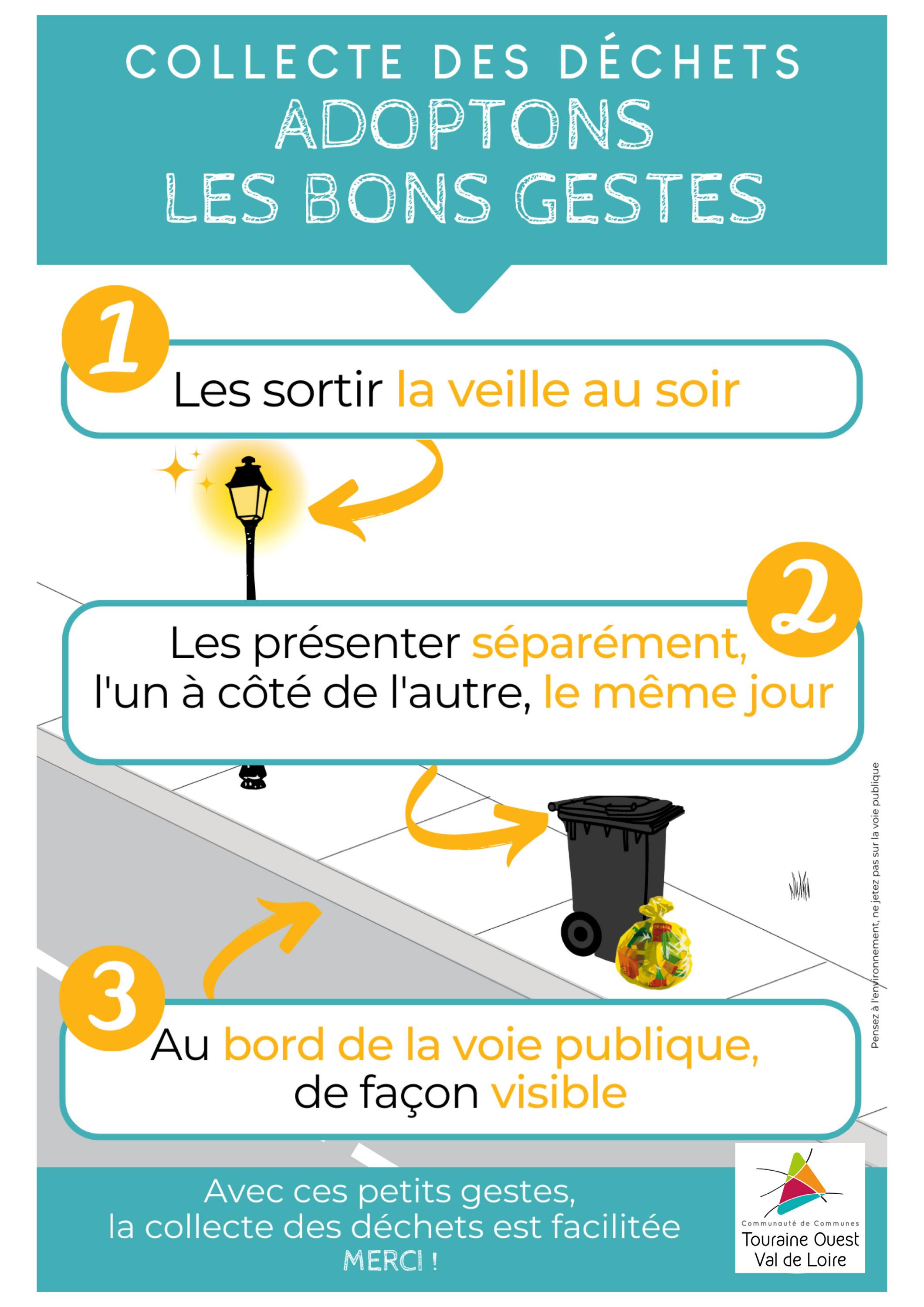 Accueil > Collecte > Collecte des ordures ménagères Collecte retour Collecte des ordures ménagères Le service prévention et gestion des déchets de la Communauté de communes Touraine Ouest Val de Loire communique sur le calendrier des collectes : Bourgueil Centre-ville de Bourgueil Autres infos : Adoptons les bons gestes Mémo du tri
