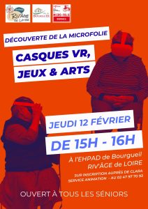 Découverte de la Micro-Folie Animation autour de la Micro-Folie, avec la découverte de casques de réalité virtuelle, de jeux et d’œuvres d’art > jeudi 12 février > De 15h à 16h > EHPAD Riv’Âge de Loire – Bourgueil >Animation ouverte à tous les seniors Inscription auprès de Clara – Service animation 02 47 97 70 93