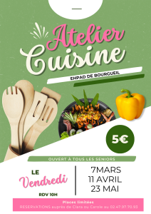Les animateurs de l’EHPAD Riv’âge de Loire organise un atelier cuisine ouvert à tous les seniors, dans ses locaux, à partir de 10h. Participation 5€. Attention : nombre de places limité / réservation auprès de Clara ou de Carole au 02 47 97 70 93