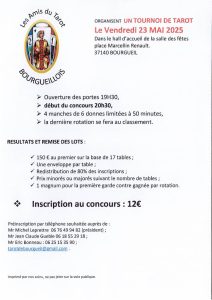 Les amis du tarot Bourgueillois organisent un tournoi de tarot, le vendredi 23 mai : Ouverture des portes à 19h30 Début du concours 20h30 précise 4 manches de 6 donnes limitées à 50 mn La dernière rotation se fera au classement Inscription au concours 12€ Préinscription par téléphone : Michel Leprettre 06 76 49 94 82 Jean-Claude Gueble 06 18 55 29 18 Eric Bonneau 06 25 15 35 90