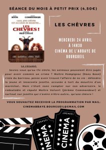 Les chèvres ! Mercredi 24 avril à 14h30 (Séance senior) Dimanche 28 avril à 17h   Soirée spéciale Montessori Le maître est l’enfant Jeudi 25 avril à 18h La nouvelle femme Jeudi 25 avril à 20h30   La nouvelle femme Vendredi 26 avril à 20h30 Samedi 27 avril à 20h30