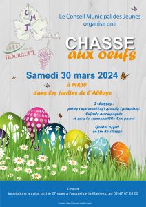 Le Conseil Municipal des Jeunes organise une chasse aux œufs, le samedi 30 mars, à 14h30 dans les jardins de l’Abbaye. Deux chasses aux œufs sont organisées pour les petits (maternelles) et les grands (primaires). Les participants doivent être accompagnés et sont sous la responsabilité d'un parent / Goûter offert en fin de chasse. Animation gratuite sur inscription au plus tard le 27 mars à l’accueil de la mairie au 02 47 97 25 00.