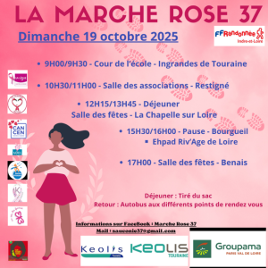 Dans le cadre d’octobre Rose et afin de sensibiliser les habitants au dépistage et à la prévention du cancer du sein, Madame AUCONIE organise une marche à travers tout le département qui passera le dimanche 19 octobre sur le Bourgueillois. Une pause est prévue à l’EHPAD Riv’âge de Loire de Bourgueil, de 15h30 à 16h