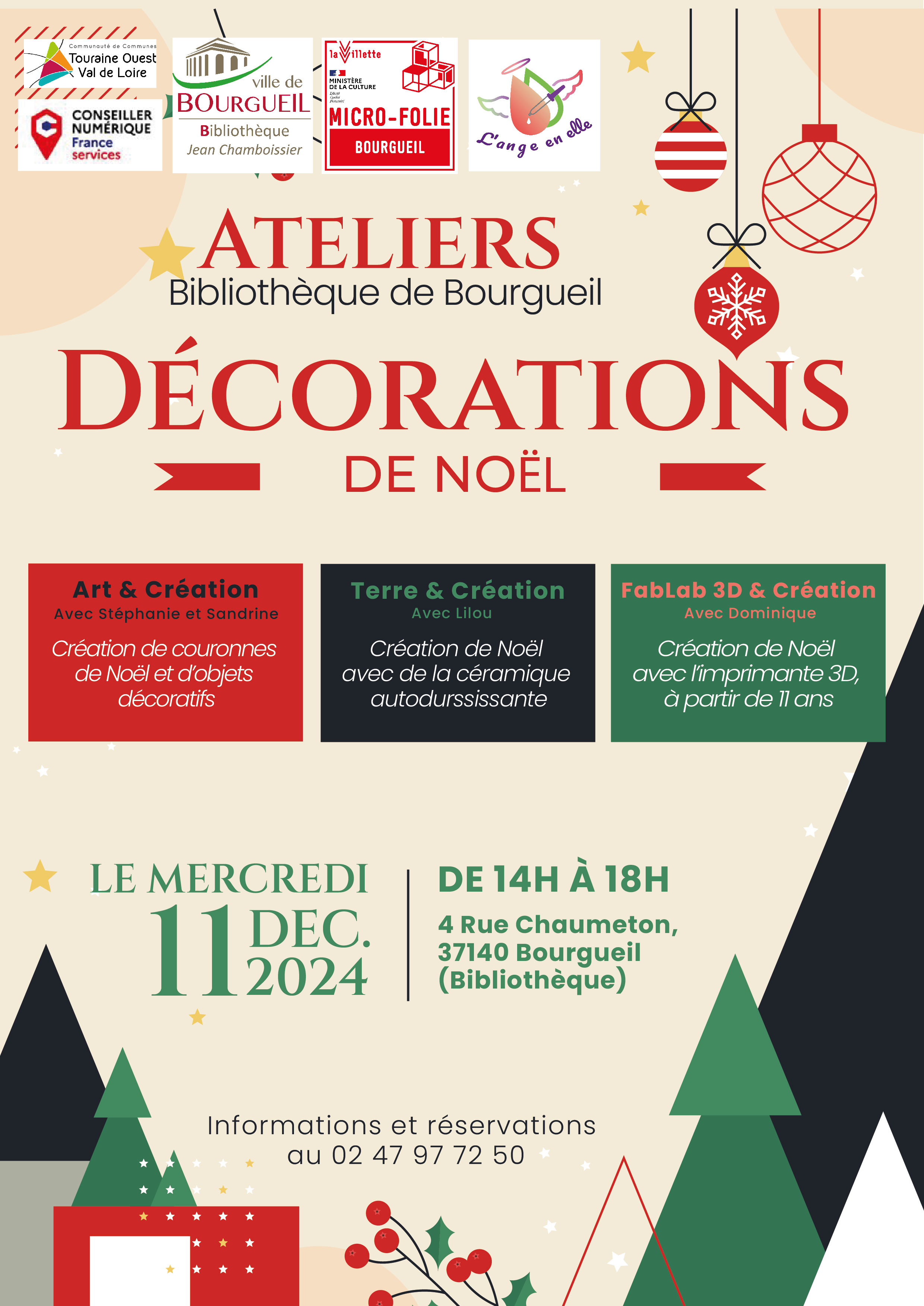 Ateliers gratuits, informations et inscriptions au 02 47 97 72 50 et à la bibliothèque.
