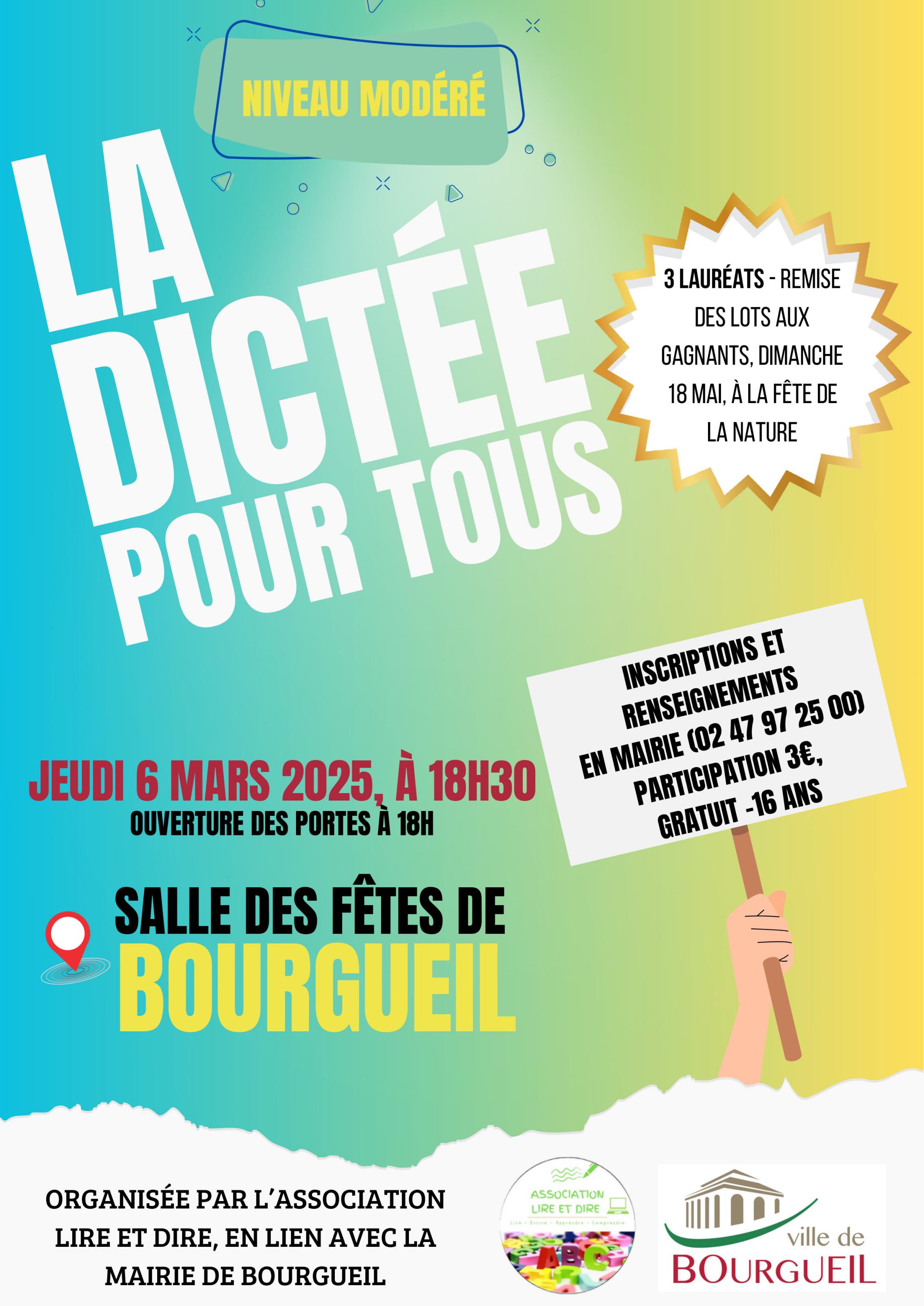 L’association Lire et Dire organise à Bourgueil, une dictée pour tous, avec difficultés modérées, le jeudi 6 mars à 18h30 à la salle des fêtes (ouverture des portes à 18h).