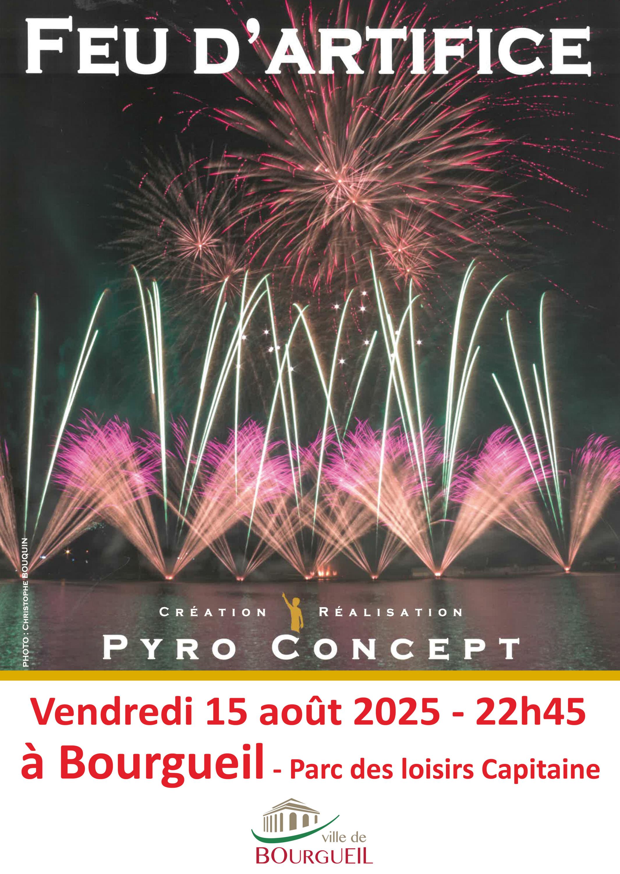 Pour clore la fête des vins du Val de Loire organisée par le comité des fêtes, la ville de Bourgueil offre un feu d’artifice musical qui sera tiré, le vendredi 15 août à 22h45, au parc des loisirs Capitaine.