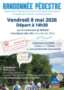 La marche annuelle du Secours Catholique avec le Rando Club de Bourgueil est programmée cette année, sur la commune de Benais. 3 parcours au choix : 5 km / ≈ 10 km ou une promenade à proximité Inscription dès 14h à la salle des fêtes de Benais Tarif : 4€/personne, gratuit pour les enfants AU PROFIT DU SECOURS CATHOLIQUE DE BOURGUEIL Co-voiturage en partance de Bourgueil : RDV à 14h, salle des Fêtes