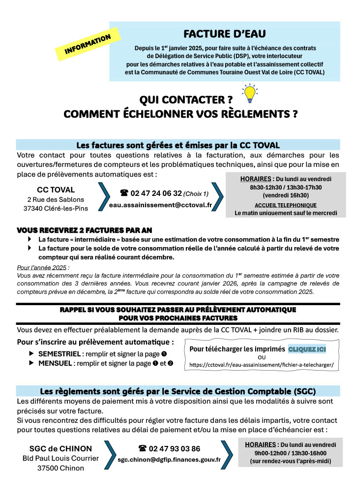Votre contact pour toutes questions relatives à la facturation, aux démarches pour les ouvertures/fermetures de compteurs et les problématiques techniques, ainsi que pour la mise en place de prélèvements automatiques est : CC TOVAL 2 Rue des Sablons 37340 Cléré-les-Pins / 02 47 24 06 32 (Choix 1) / eau.assainissement@cctoval.fr