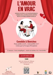 Charlotte, épouse et mère modèle un tantinet coincé, retrouve sa sœur Claire, divorcée et totalement libérée, à l'occasion du mariage de sa cadette. Des retrouvailles explosives qui feront remonter en surface, rancœurs, colères, déceptions...…mais aussi complicité retrouvée et éclats de rires ! Au cours de cette journée inoubliable, Claire et Charlotte balayeront leurs a priori et leurs craintes pour enfin avancer vers de nouveaux horizons. Tarif : 7€ Gratuit – de 12 ans Réservations au 06 65 60 48 33