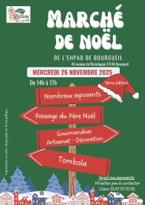 Le Marché de Noël de l’EHPAD de Bourgueil revient pour sa 5ème édition. Rendez-vous le mercredi 26 novembre 2025 de 14h à 17h au 40 avenue de Reimlingen, 37140 Bourgueil. Au programme : De nombreux exposants Le passage du Père Noël Gourmandises, artisanat et décorations Une tombola Un moment convivial à partager autour de la magie de Noël. Avis aux exposants : pour participer, contactez Clara au 02 47 97 70 93.