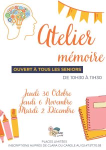 Vous souhaitez stimuler votre mémoire dans une ambiance conviviale ? Participez à notre atelier mémoire, ouvert à tous les seniors, de 10h30 à 11h30. Prochaines séances : Jeudi 30 octobre Jeudi 6 novembre Mardi 2 décembre EHPAD Riv’Âge de Loire Places limitées – Inscription auprès de Clara ou Carole au 02 47 97 70 93.