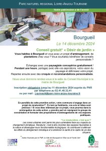 Vous habitez à Bourgueil et vous avez un projet d’aménagement, de plantations chez vous ? Vous souhaitez bénéficier de conseils personnalisés ? Échangez avec une paysagiste conceptrice gratuitement ! Pendant une heure, partagez avec elle vos aspirations, votre vision du paysage et définissez votre projet. Repartez ensuite avec des croquis et recommandations personnalisés. En Mairie (salle du Conseil Municipal) – créneaux de 1h par habitant Inscription obligatoire, au plus tard le 11 décembre, auprès du PNR par téléphone au…